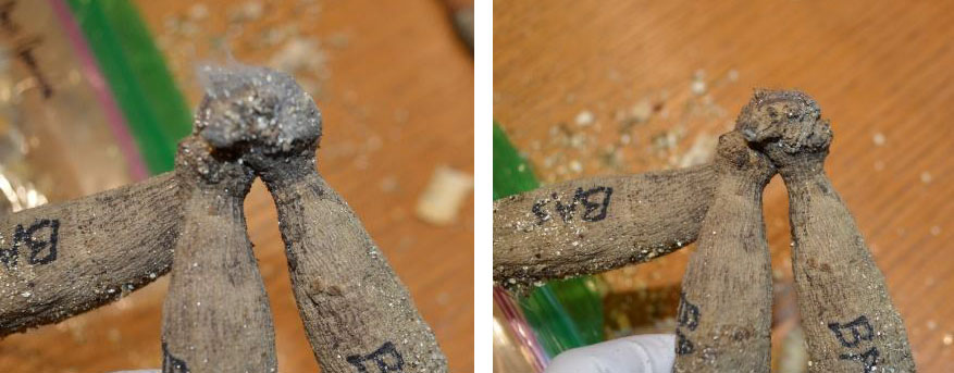The crown area is carefully brushed off with a soft, small, paint brush to remove any debris covering the eyes. Note the photo with the tuber just coming out of the bag followed by the one with the cleaned crown area. Be gentle as some eyes might already be growing and you don’t want to break them off. They will often produce new eyes from that area but it takes awhile.